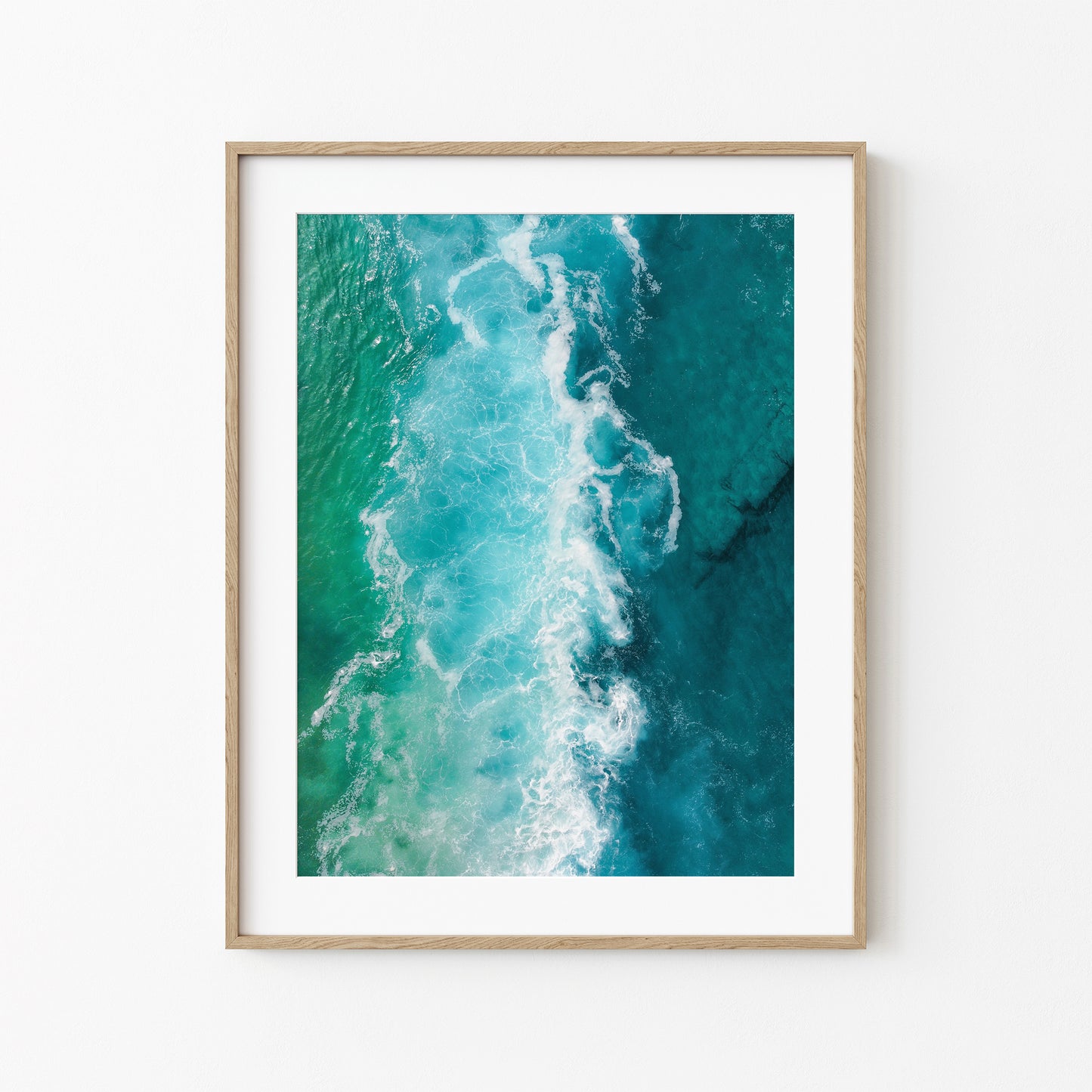 A top-down view where the ocean tells its own quiet story. In three distinct bands of color, the sea reveals its hidden structure—layered, tranquil, and infinite. This print captures beauty in separation and balance.